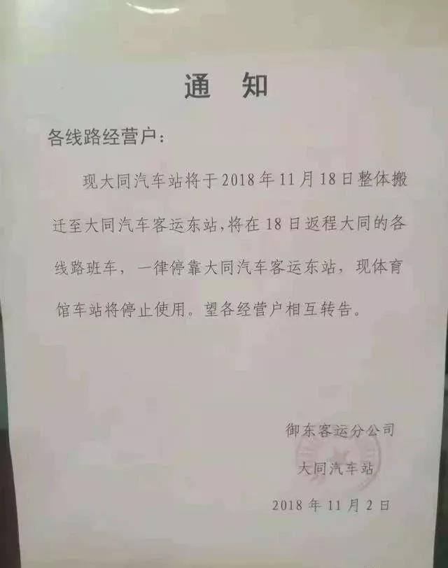 現(xiàn)大同汽車站將于 2018 年 11 月 18 日整體搬遷至大同汽車客運(yùn)東站,將在 18 日返程大同的各線路班車,一律?看笸嚳瓦\(yùn)東站,現(xiàn)體育館車站將停止使用。